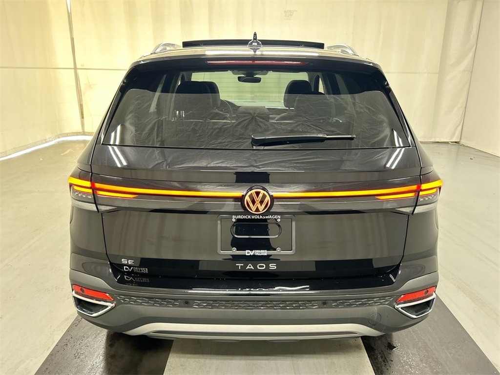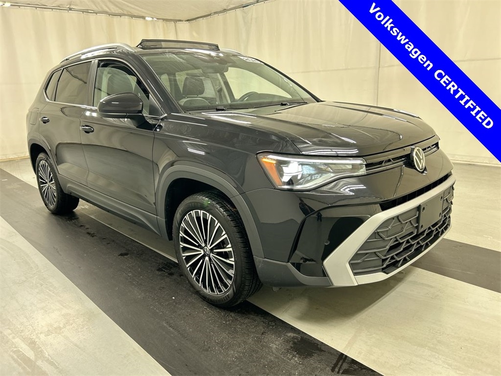Certified. Deep Black Pearl 2025 Volkswagen Taos 1.5T SE FWD 8-Speed Automatic with Tiptronic 1.5L I4 Turbocharged DOHC 16V LEV3-SULEV30 174hp **Remote car starter**, **Qualifies for VW new car rebate! (currently is 2,500.00), Heated Front Bucket Seats, Panoramic Sunroof Package.